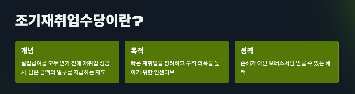 조기재취업수당은 실업급여(구직급여)를 모두 받기 전에 재취업에 성공한 사람에게 남은 실업급여의 일부를 현금으로 지급하는 제도입니다.
