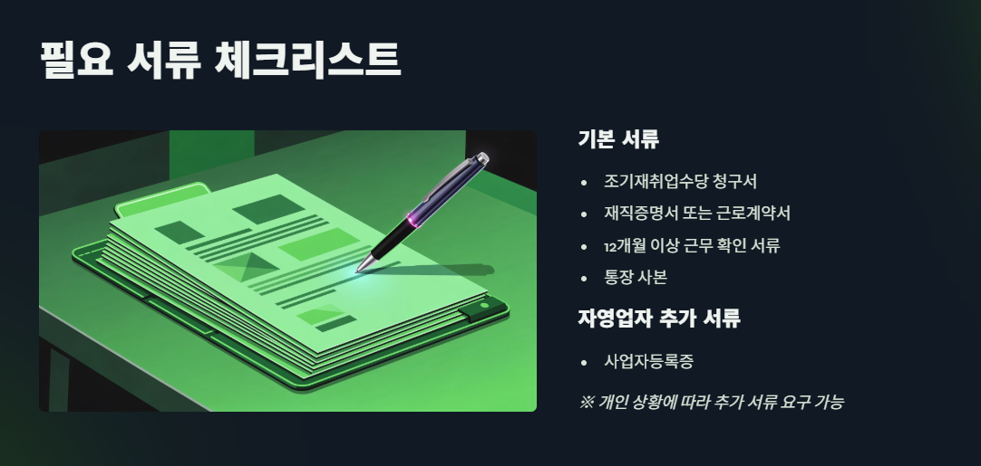개인 상황에 따라 추가 서류를 요구받을 수 있으므로 신청 전 고용센터 상담을 권장합니다.