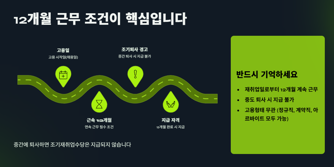 특히 12개월 이상 근무 조건이 핵심입니다. 중간에 퇴사하면 조기재취업수당은 지급되지 않습니다.