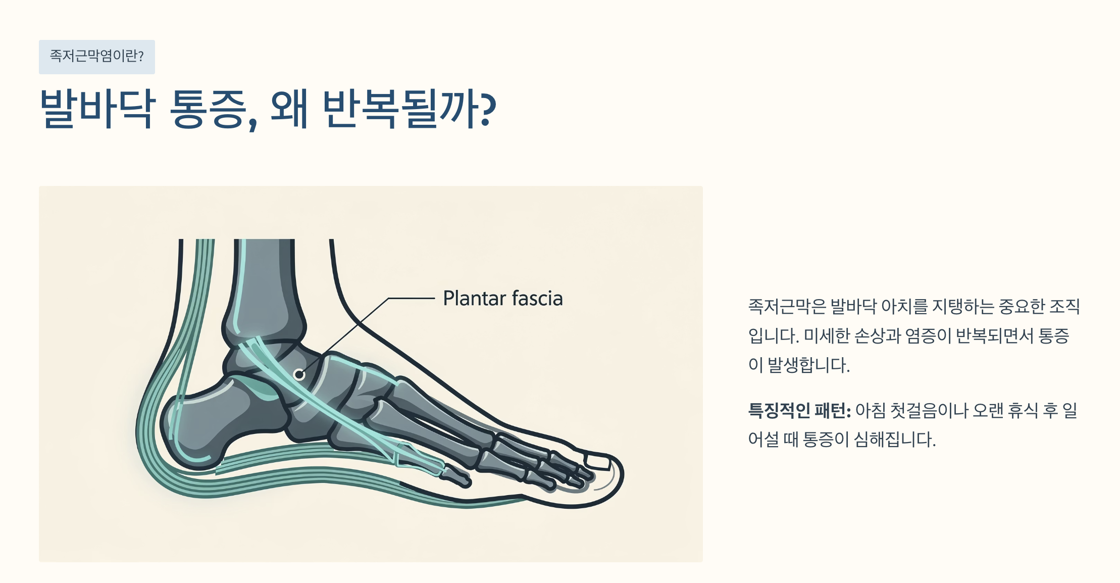 아침에 일어나 첫발을 디딜 때 발바닥이 찌릿하게 아프거나, 오래 앉아 있다가 일어서면 통증이 심해지는 경험을 해본 적 있으신가요? 많은 분들이 이를 단순한 피로라고 넘기지만, 이러한 증상은 족저근막염의 대표적인 초기 신호일 수 있습니다.
