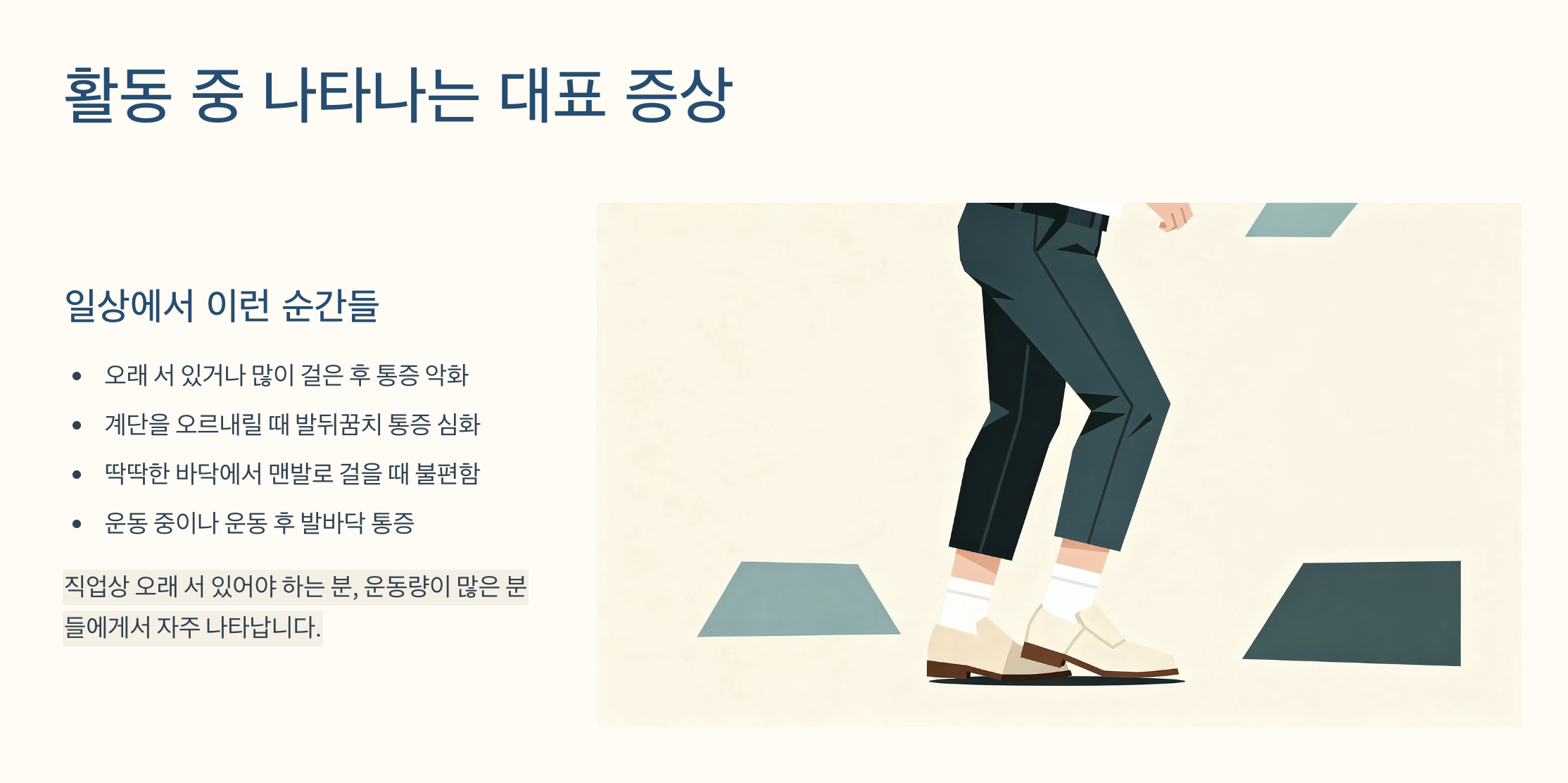 - 딱딱한 바닥에서 맨발로 걸을 때 통증 증가