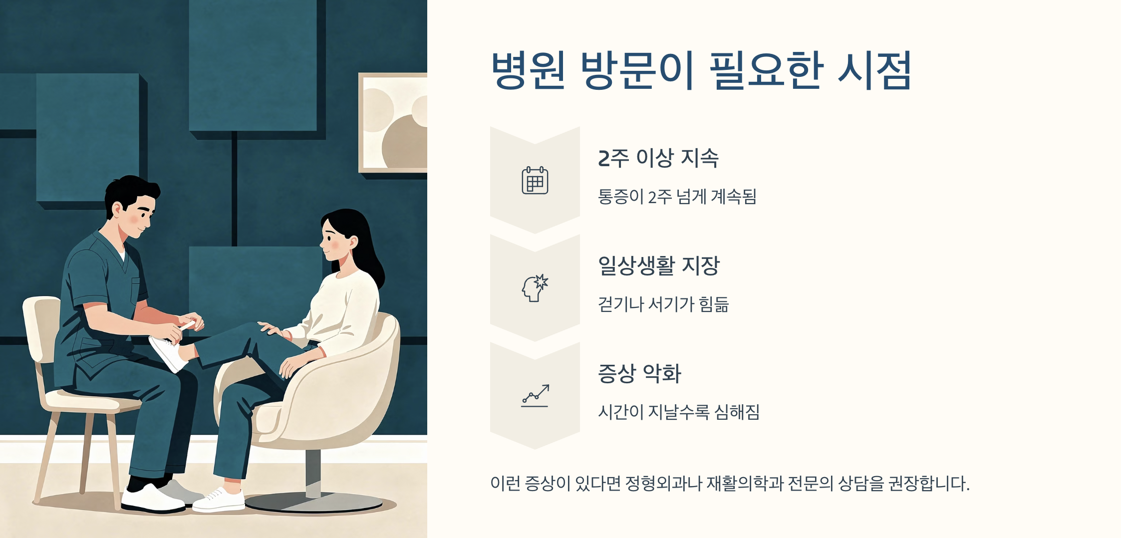 A. 2주 이상 통증이 지속되거나 일상생활에 지장이 있다면 병원 진료를 권장합니다.