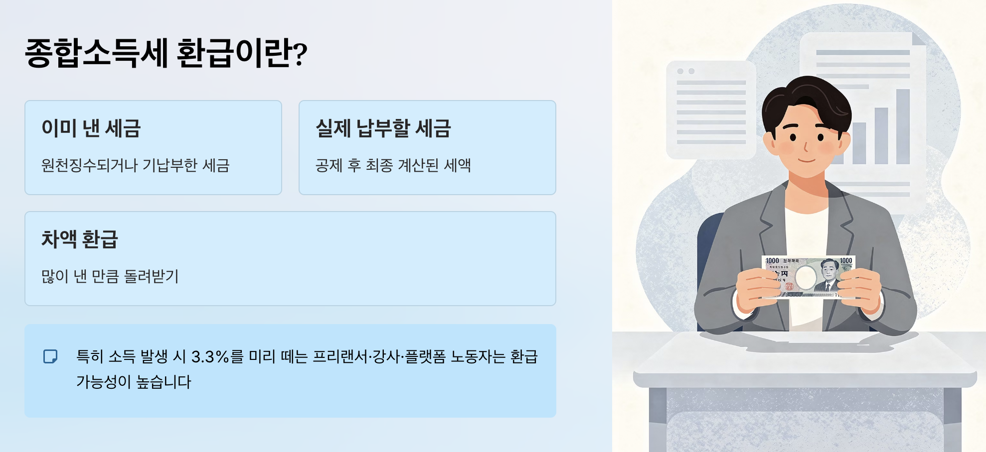 종합소득세 환급이란 이미 납부했거나 원천징수된 세금이 실제로 내야 할 세금보다 많을 경우, 그 차액을 다시 돌려받는 것을 의미합니다.