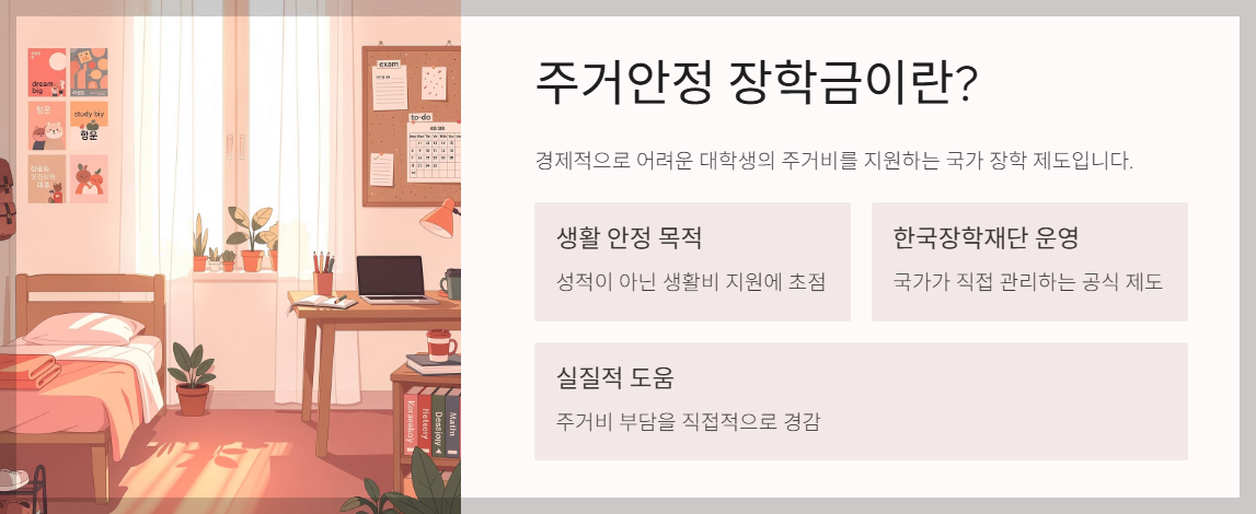 주거안정 장학금은 경제적 사정으로 인해 주거비 부담이 큰 대학생을 대상으로 주거 관련 비용을 지원하는 국가 장학 제도입니다.