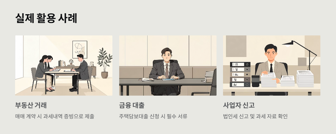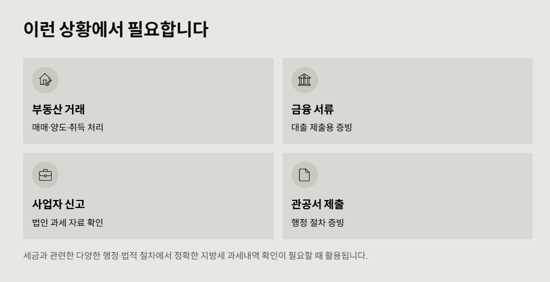 예를 들어 부동산 거래, 금융기관 제출용 서류, 기업 사업자 신고용 자료 등 여러 행정 절차에서 지방세 과세내역을 정확히 확인해야 할 때 활용됩니다.