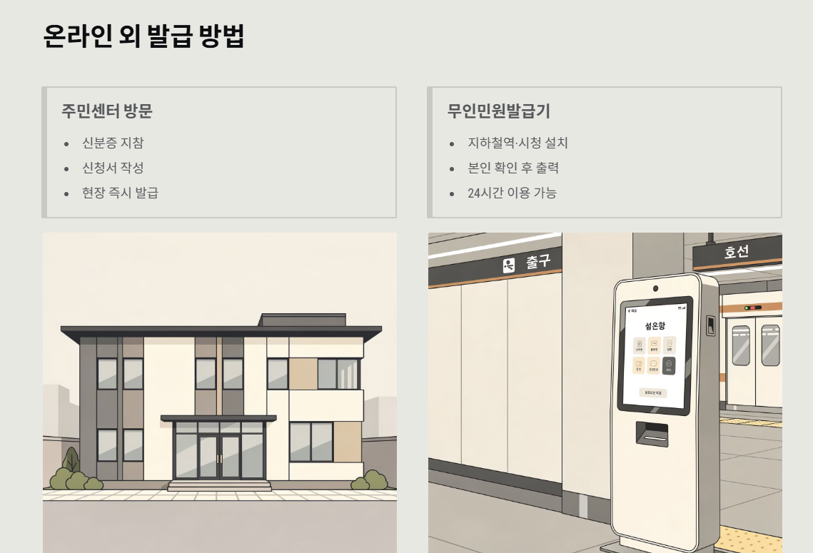 지하철역이나 시청, 주민센터 등에 설치된 무인민원발급기에서도 본인 확인 후 증명서를 즉시 출력할 수 있습니다.