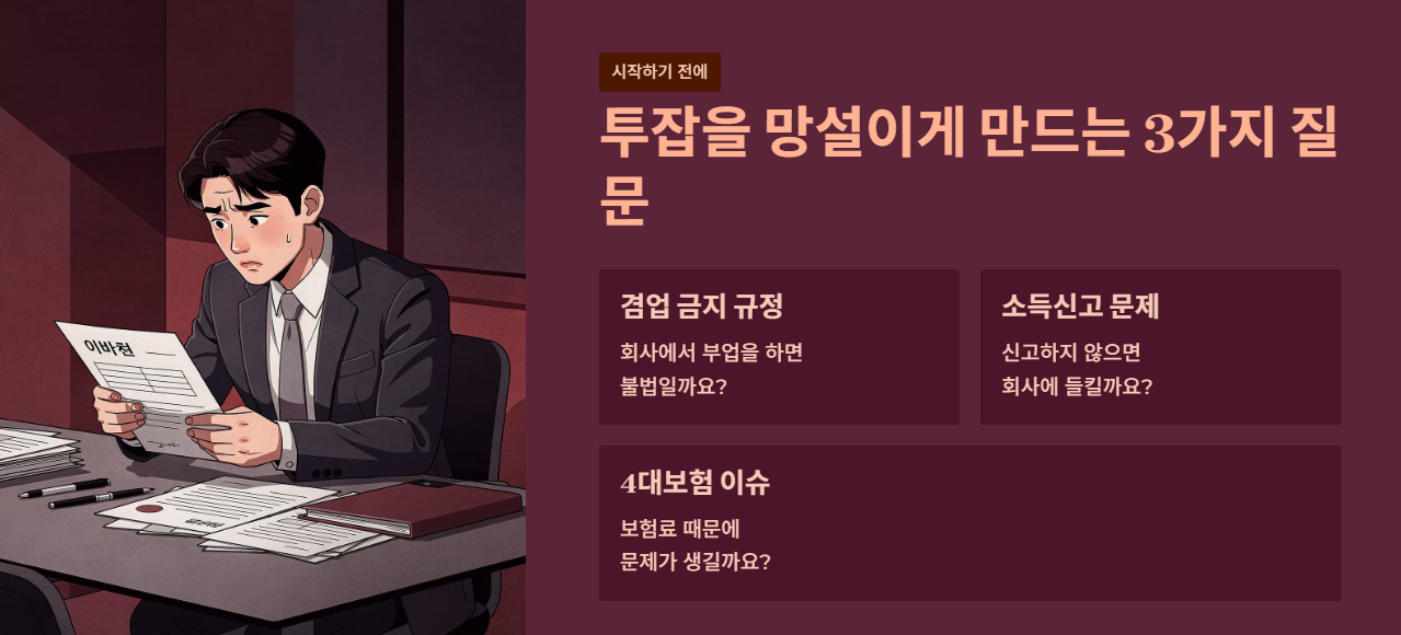 실제로 많은 직장인들이 회사 규정, 세금, 4대보험 문제 때문에 투잡을 시작하기 전부터 불안감을 느끼고 포기하기도 합니다.