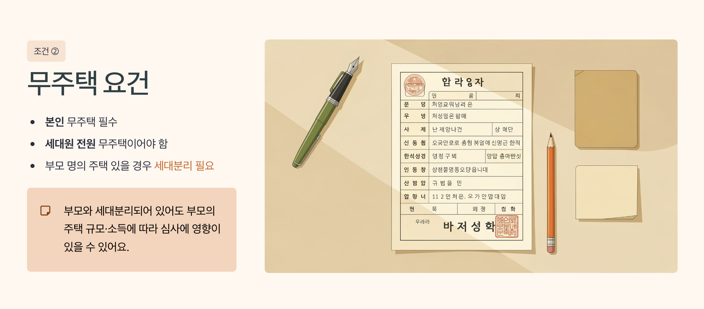 대출 신청자 본인뿐 아니라 세대원 전원이 무주택자여야 합니다. 부모 명의 주택에 세대분리가 되어 있더라도 조건에 따라 심사가 까다로울 수 있습니다.
