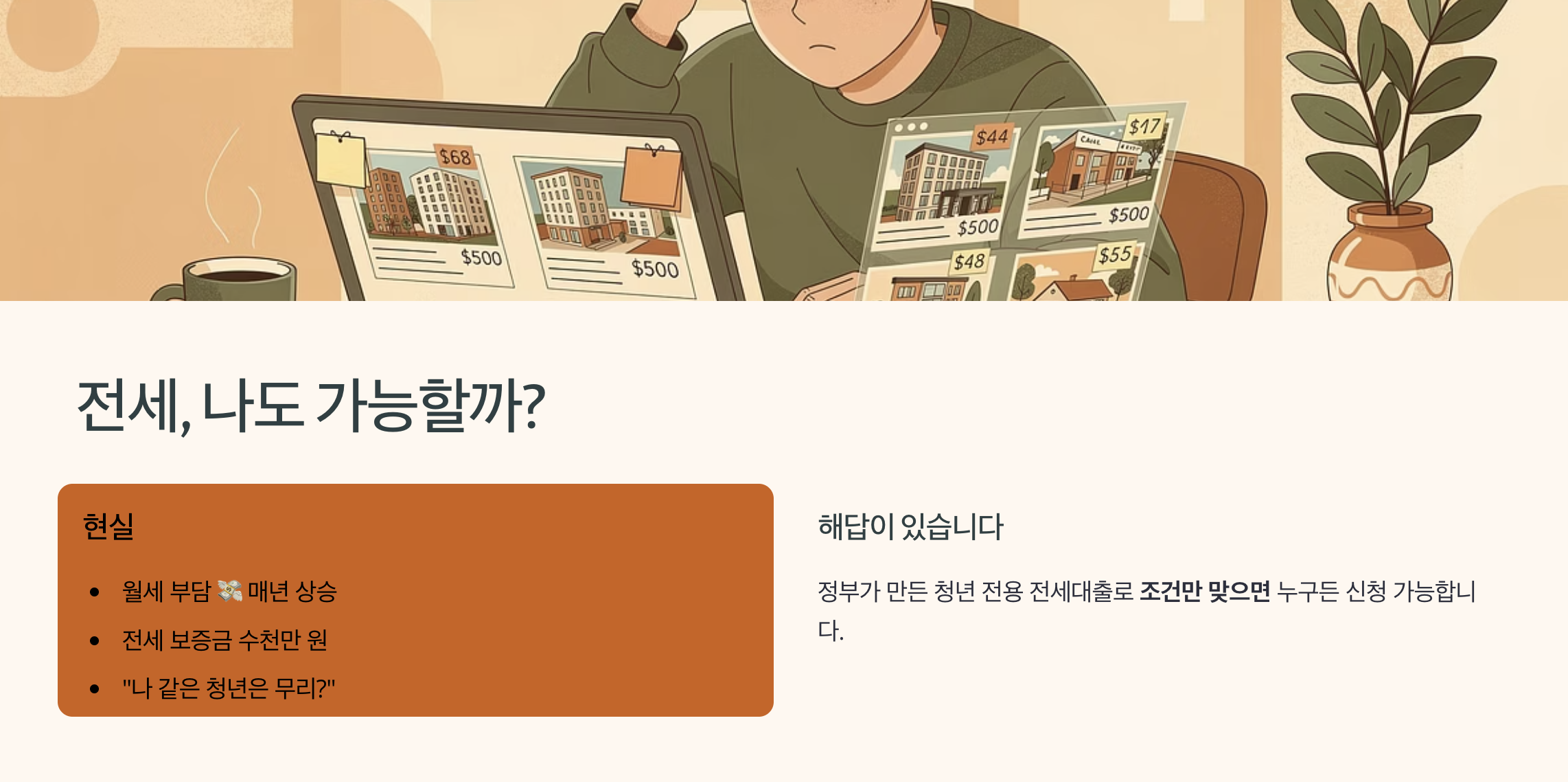 사회초년생이나 취업 준비 중인 청년에게 전세자금 마련은 가장 큰 현실적 고민입니다. 월세 부담은 커지고, 전세 보증금은 수천만 원 단위로 높아지면서 “나 같은 청년도 전세가 가능할까?”라는 질문을 많이 하게 됩니다.