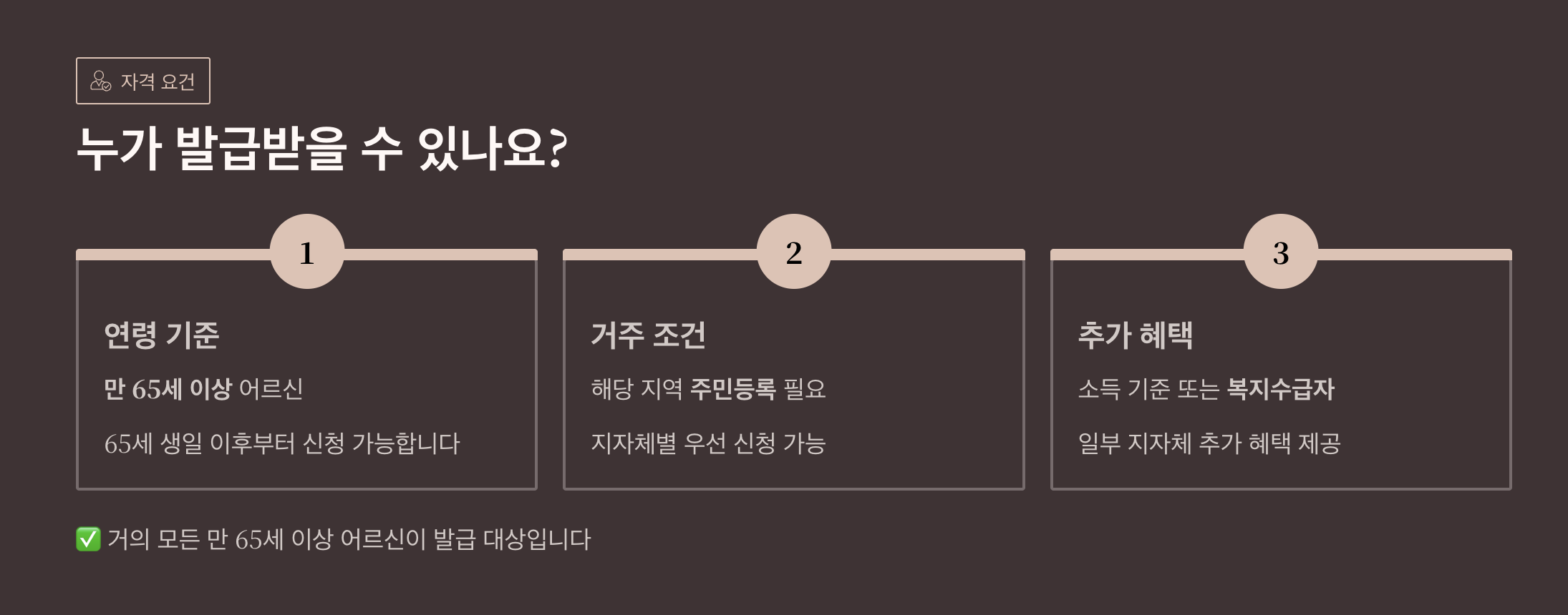 즉, 기본 기준은 만 65세 이상이라면 거의 대부분 발급 대상입니다. 다만 각 지방자치단체별로 소득 기준 등을 추가로 설정하는 경우도 있기 때문에 신청 전에 확인이 필요합니다.