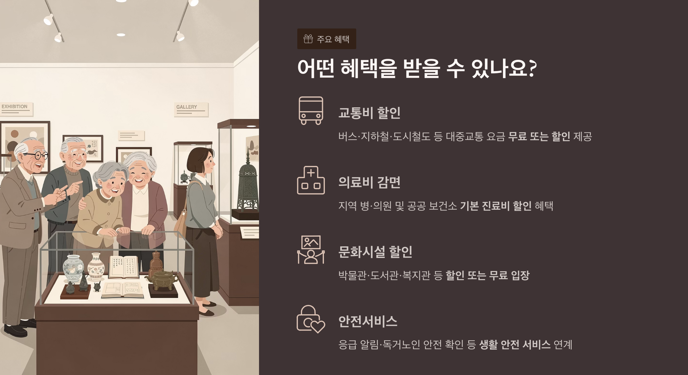 박물관, 도서관, 복지관, 공공문화시설 등 할인 또는 무료 입장 혜택 제공.