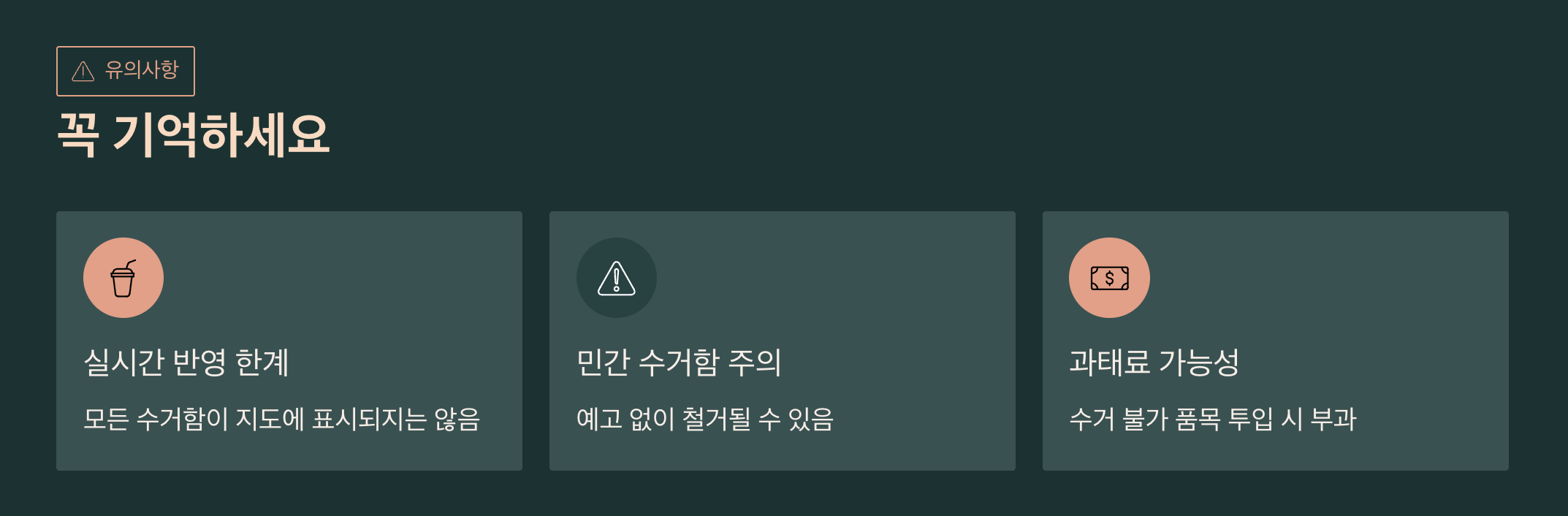 - 민간 수거함 : 위치 변동 잦음, 수거 중단 가능성