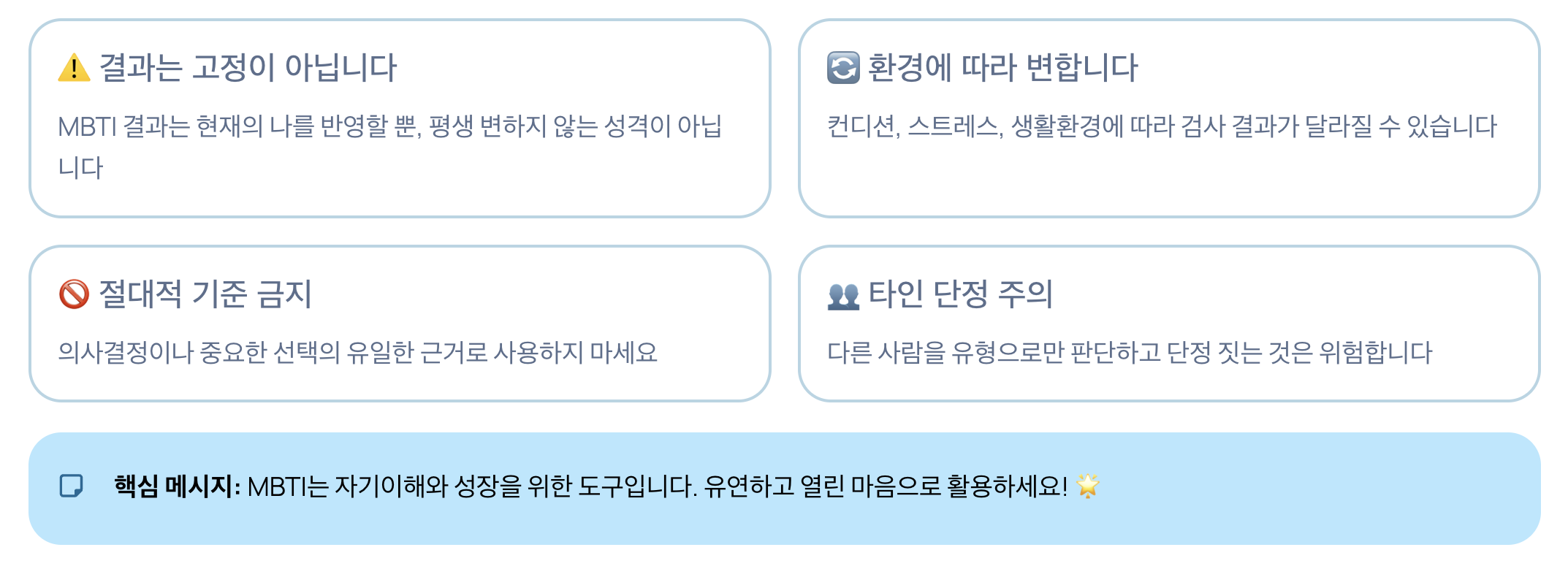 MBTI 결과에 자신을 가두기보다는, 나를 이해하고 성장시키는 참고 자료로 활용하는 것이 가장 이상적인 방법입니다.